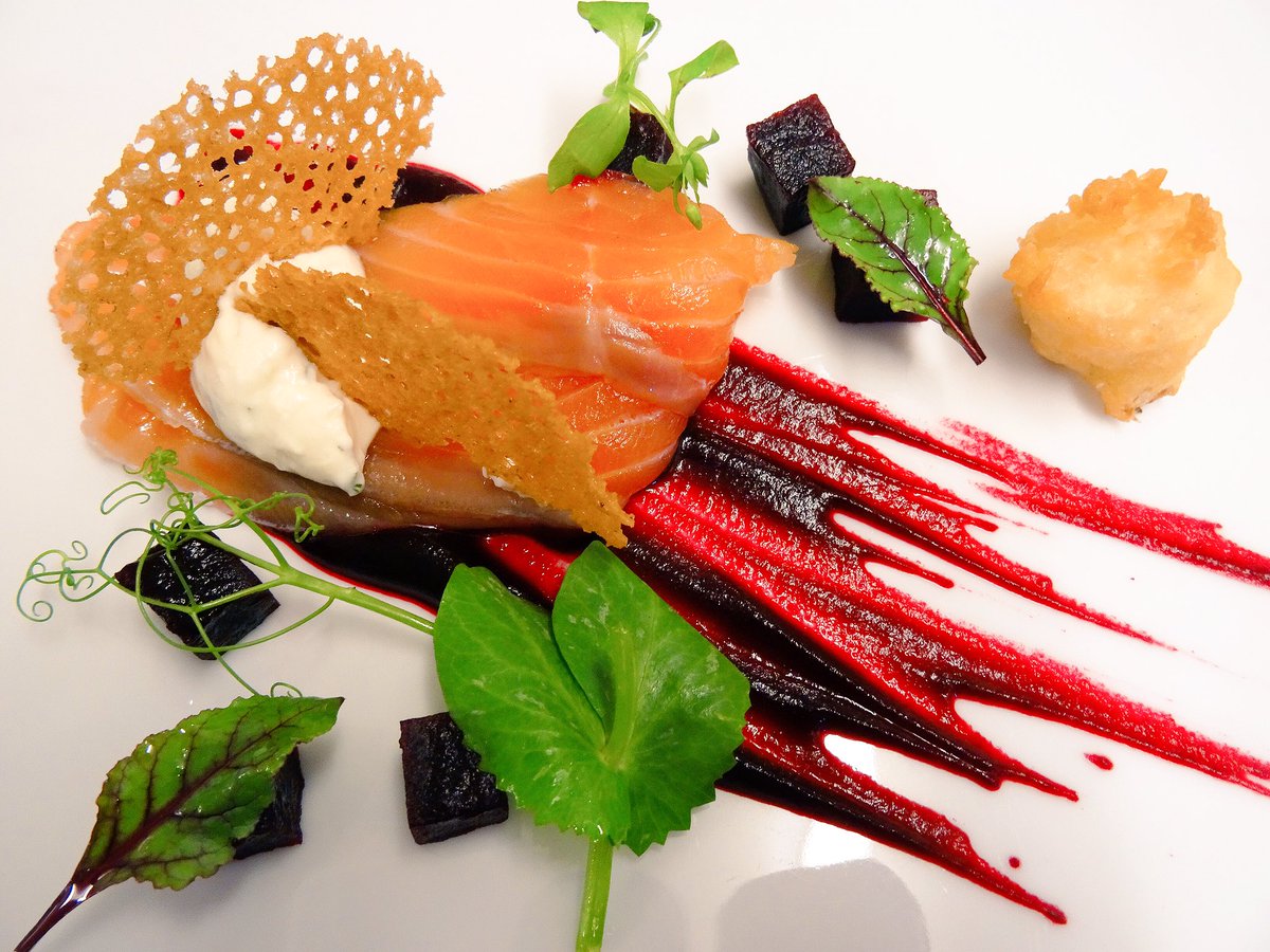 Gravlax ,Beetroot ,Horseradish,Cauliflower Beignet ,Olive Tuile