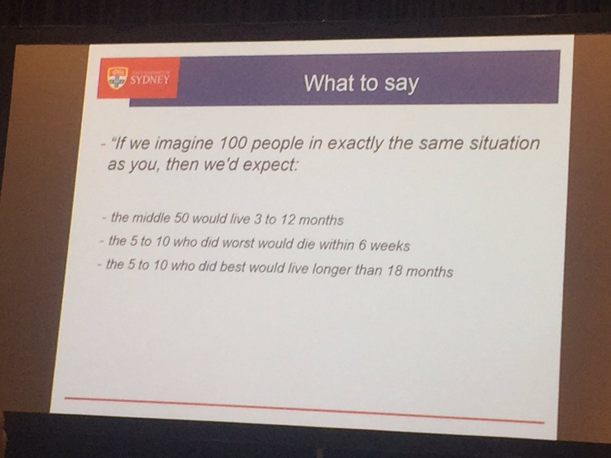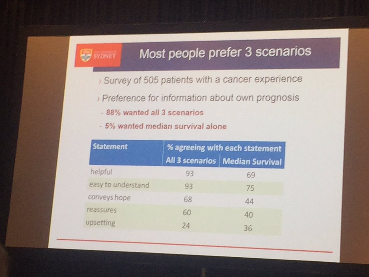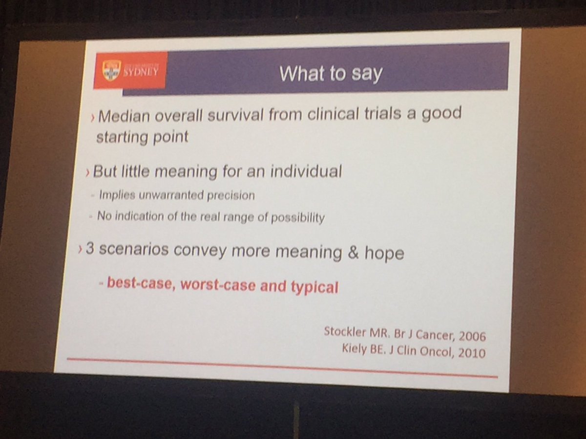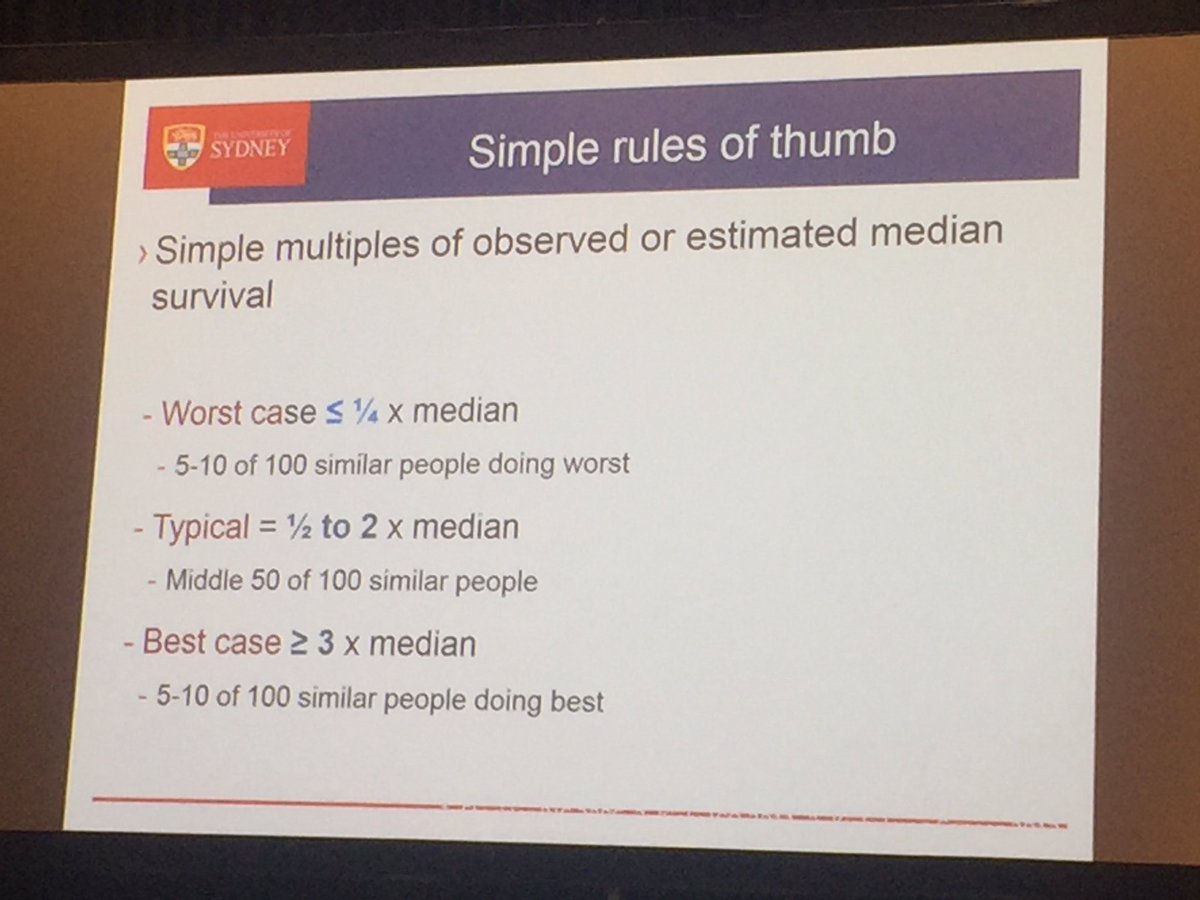 Giving 3 scenarios (best-, worst-case & typical) is more useful than giving median survival