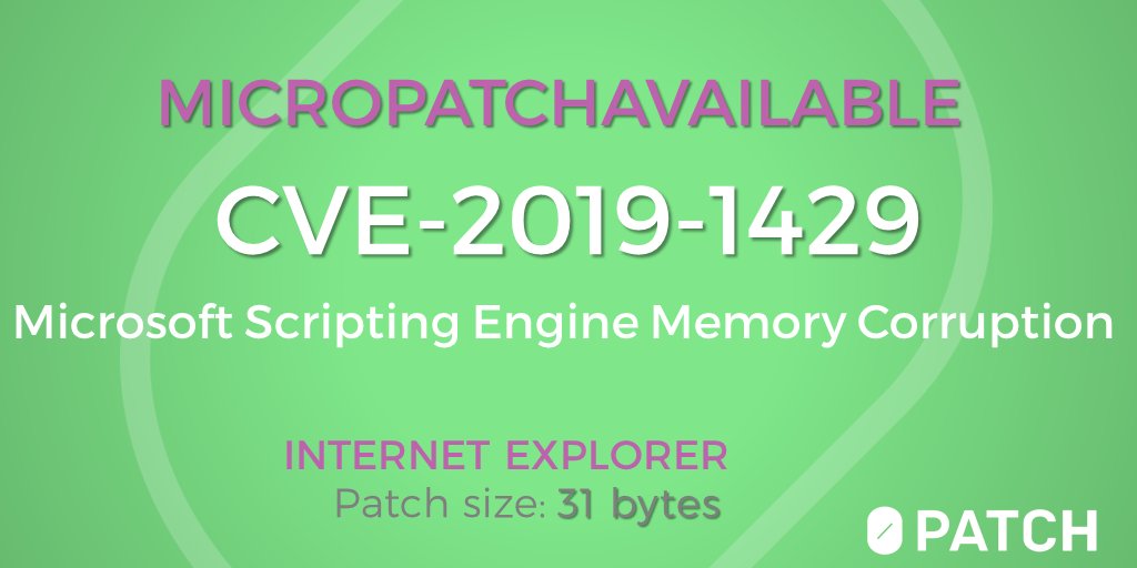 Today we issued a micropatch for CVE-2019-1429, a use-after-free vulnerability in Microsoft Scripting Engine that is being exploited in the wild. While it isn't a 0day (November Windows Updates include a fix), we decided to micropatch it for users who can't apply MS update (yet).pic.twitter.com/sqiHtLRUxd