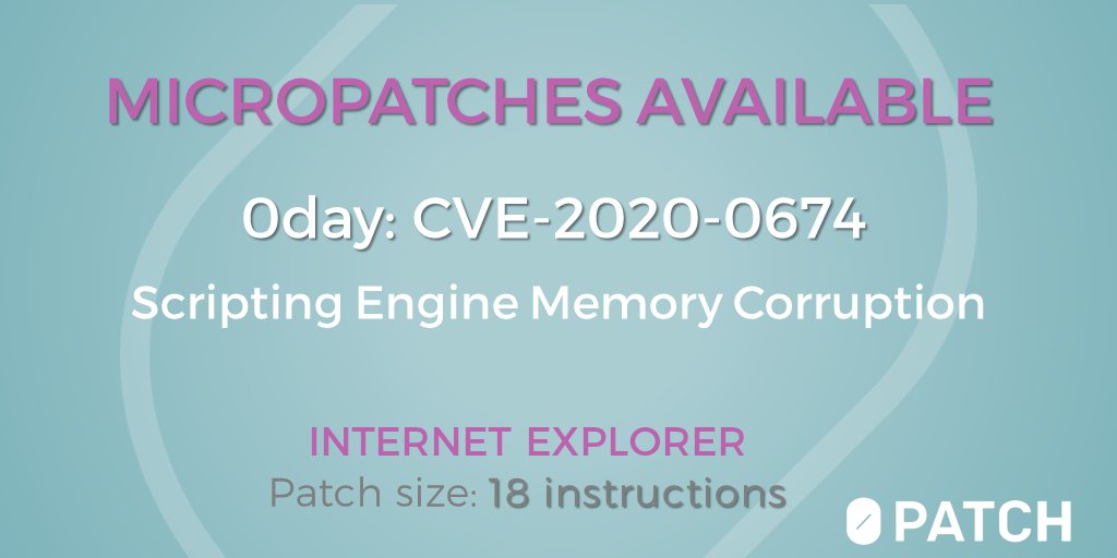 Micropatching a Workaround for CVE-2020-0674 https://blog.0patch.com/2020/01/micropatching-workaround-for-cve-2020.html …pic.twitter.com/QUphiwNFR3
