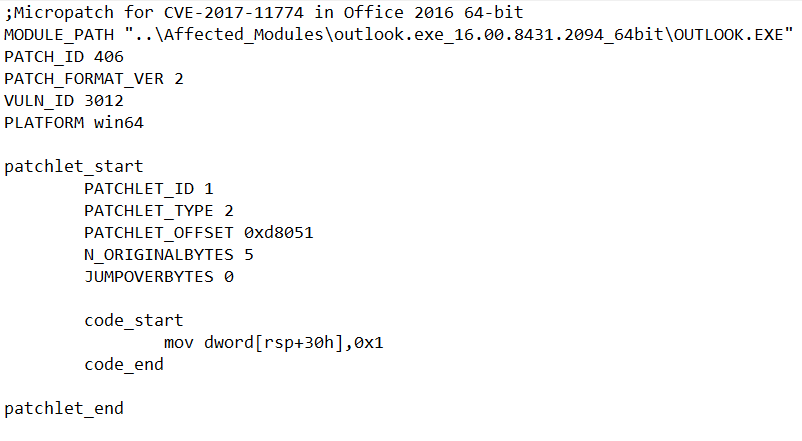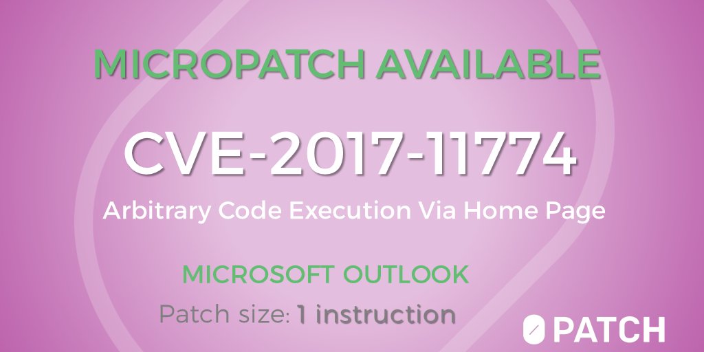 We issued a micropatch for CVE-2017-11774, a remote code execution vulnerability in Outlook that has been widely exploited and remains popular with attackers. In contrast to official patch which could be reverted by non-admins, micropatch will reliably disable Outlook Home Page.pic.twitter.com/3MW0l0PvuV