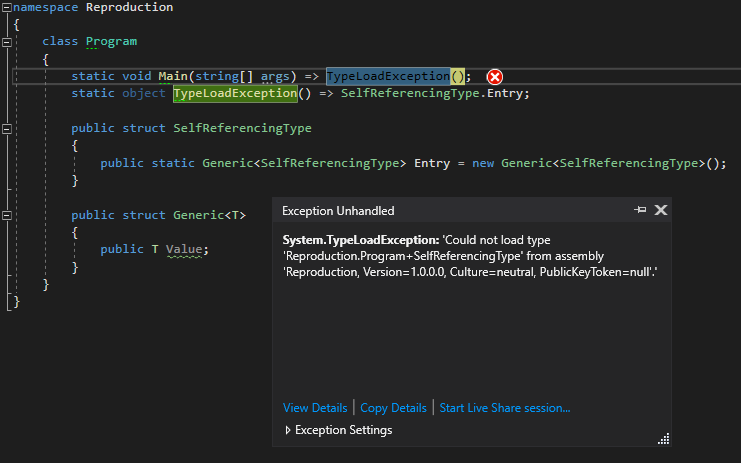 @VisualStudio debugger bug with@dotnet Core. Summary: 1. Create two AssemblyLoadContext(s), each loading different versions of the same external assembly. 2. In the ALC with the newer version, return a value using an API not available in the older version.pic.twitter.com/l4oW9KFTxs