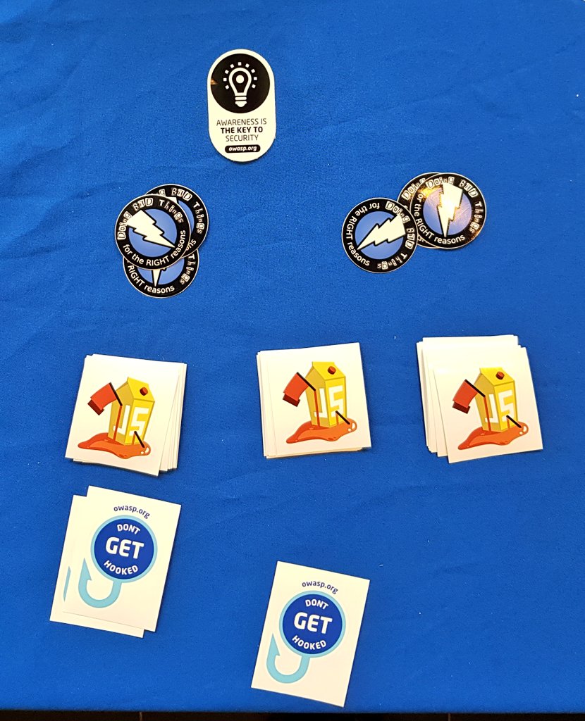 Stats: 700 stickers and 600 flyers given away. 5 volunteers on rotation. Average stand shift 2.4 hours. Most common question: how can I improve my security awareness. Most common answer: read docs and use the juice shop.