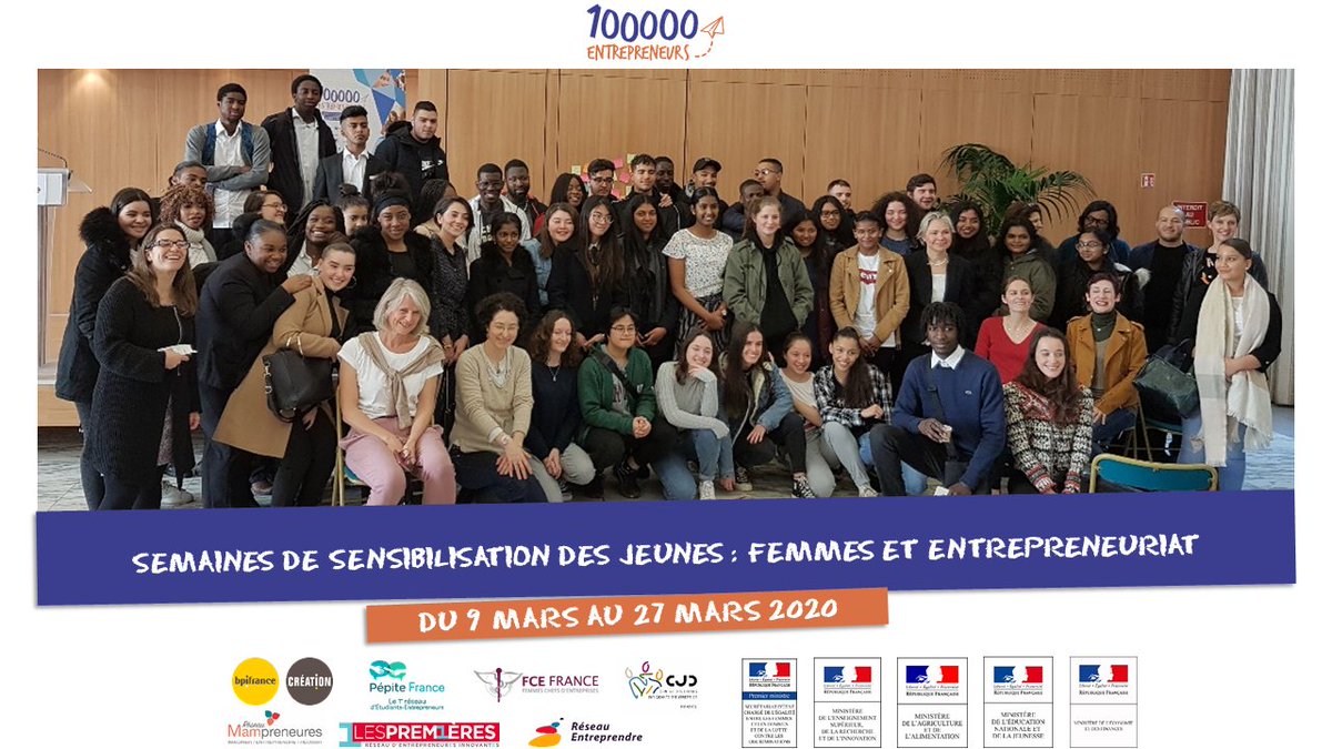 #SemaineEF Avis aux#ÉtudiantesEntrepreneures : dans le cadre des "Semaines de Sensibilisation des Jeunes : Femmes et Entrepreneuriat" du 9-27 mars 2020 avec@100000e, venez témoigner de votre aventure entrepreneuriale dans les écoles ! Intéressée ? https://lnkd.in/dT3w5je pic.twitter.com/VgfvBPncqp
