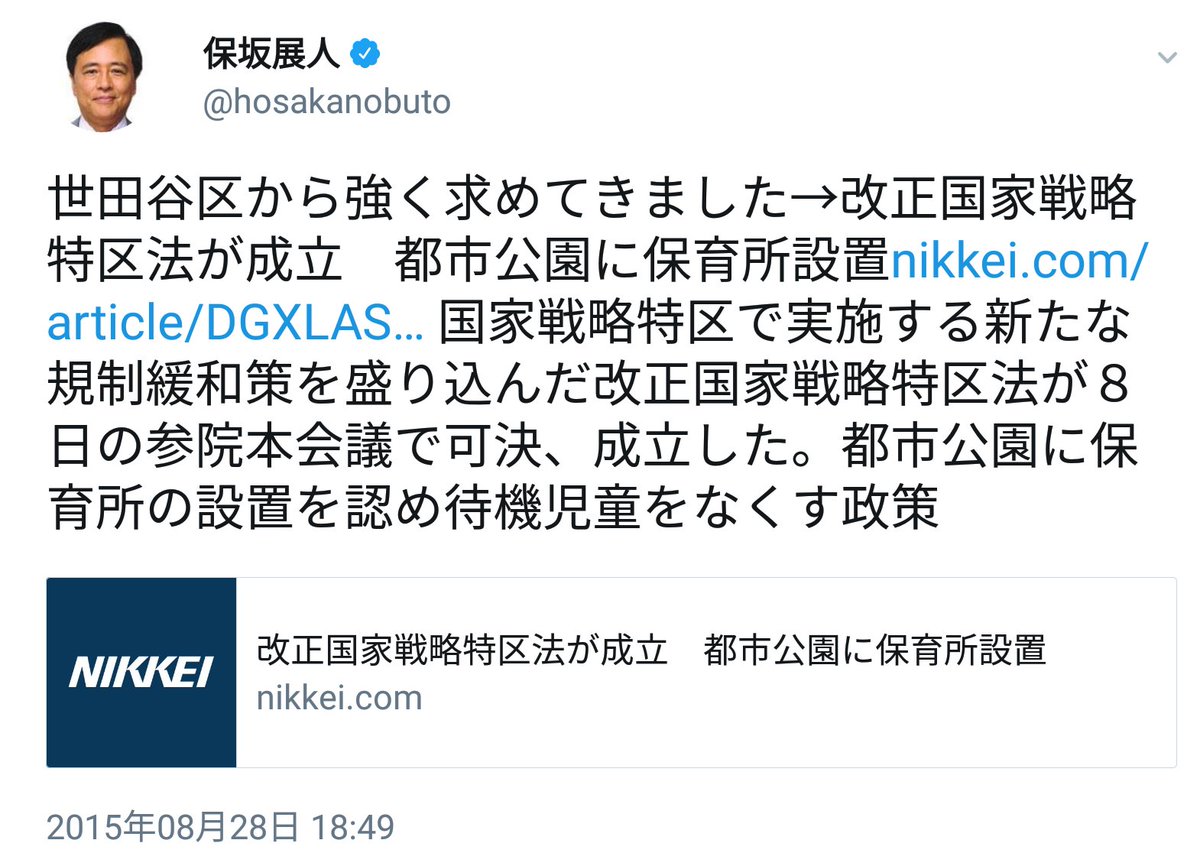 #世田谷 区は、国家戦略特区を使い、昨年4月に保育所を開設しておりました。しかし、#世田谷区 長の#保坂展人 氏はその頃から、同じ国家戦略特区と使った今治市を加計学園問題で何度も叩いてきました。 自分の特区はいい特区、他人の特区は悪い特区ということですかね? http://www.city.setagaya.lg.jp/kurashi/107/157/802/d00143052_d/fil/15-3.pdf …このスレッドを表示 -