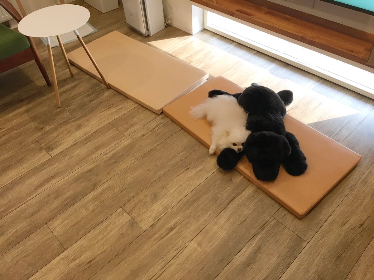 たった2ヶ月の間に同居犬が2匹天国に行ってしまって、1匹残されたポメラニアンを心配した実家が同居犬と同じぬいぐるみをくれたんだけど、こんなに暑いのに毎日寄り添って昼寝してる。飼い主も辛いけど、犬も辛いよね…山とか海とかいっぱい散歩行こうね(;_;)pic.twitter.com/16E0FqxJTd