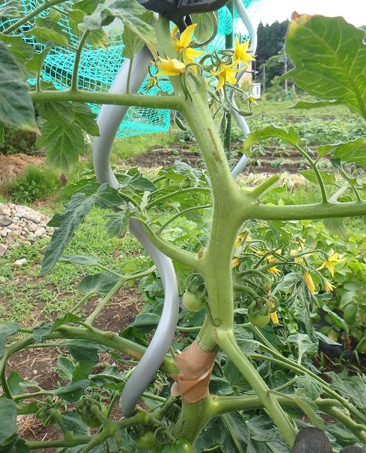 ポキッと折れてしまったトマトの枝もガムテープで繋げば大丈夫、花芽もちゃんとつきました(^o^)/ タマネギも収穫どきですが昼から雨で後回しですね