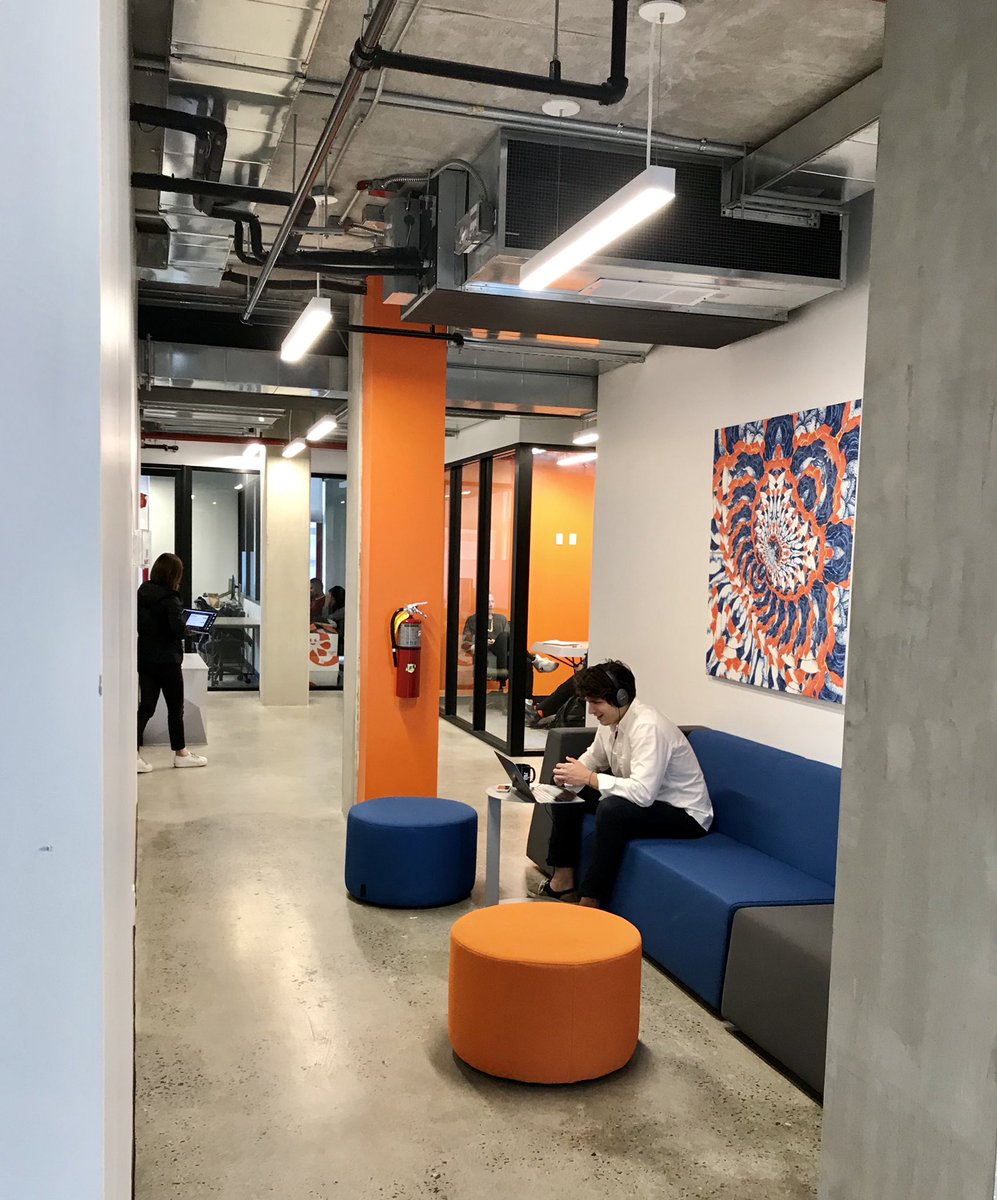 @100Bogart, an entire building of coworking in the Bushwick neighborhood. Modern industrial with a VIDEO GAME ROOM