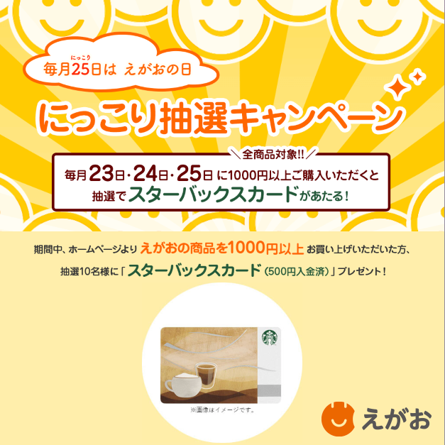 明日25日は「えがおの日」です!! 皆様が毎日にっこりと生活できるように 毎月23日・24日・25日に にっこり抽選キャンペーン開催!! https://www.241241.jp/event/2020/0124/ … 運がよければスタバカードが当たるかも!!