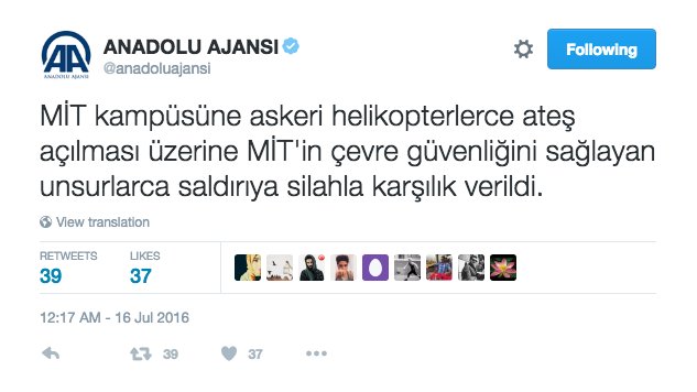 Anadolu Ajansı, MİT kampüsüne askeri helikopterlerce ateş açılması üzerine MİT'in karşılık verdiğini duyurdu.pic.twitter.com/SxtLkDiquc