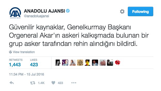 Anadolu Ajansı: "Kalkışma, FETÖ/PDY mensubu bir grup subay tarafından yapılmaya çalışılmaktadır.”pic.twitter.com/9uP0PYsOwD