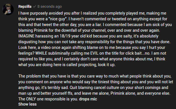 I'm sick of The Rewired Soul blaming Cancel Culture, Drama Channels, Primink and anyone else he can but himself for his actions, Comment I left on his video so you don't have to watch it. smh https://twitter.com/TheRewiredSoul/status/1178151346169511936 …pic.twitter.com/H9814GLDuN