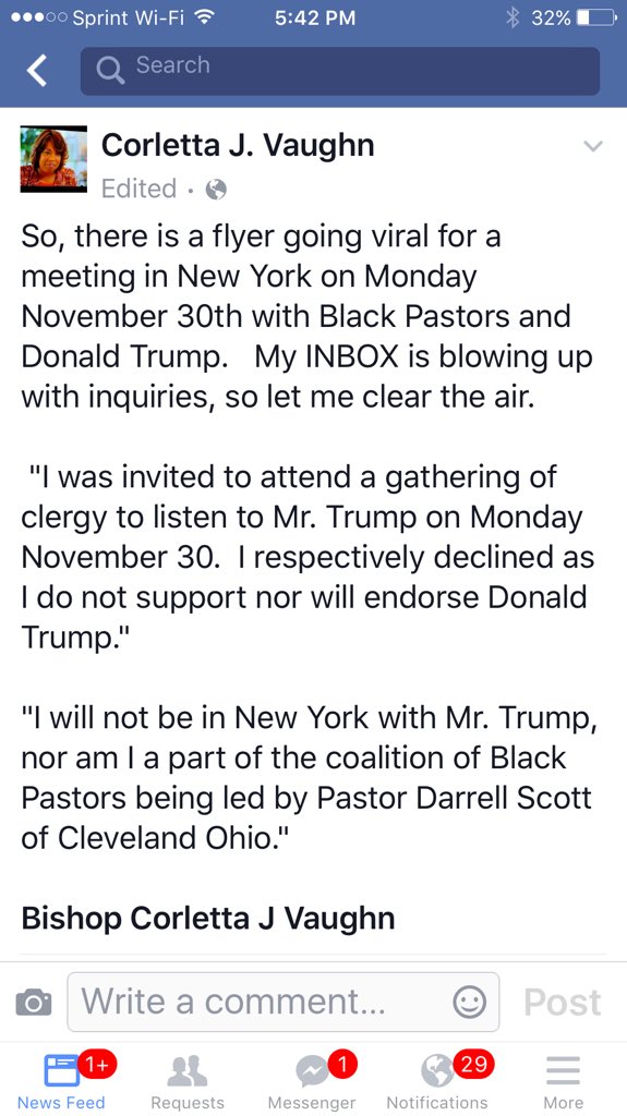 Folks, @BishopCVaughn announced in Facebook she will not be attending or endorsing Trump. Always verify first!pic.twitter.com/Q2M49wcUJ2