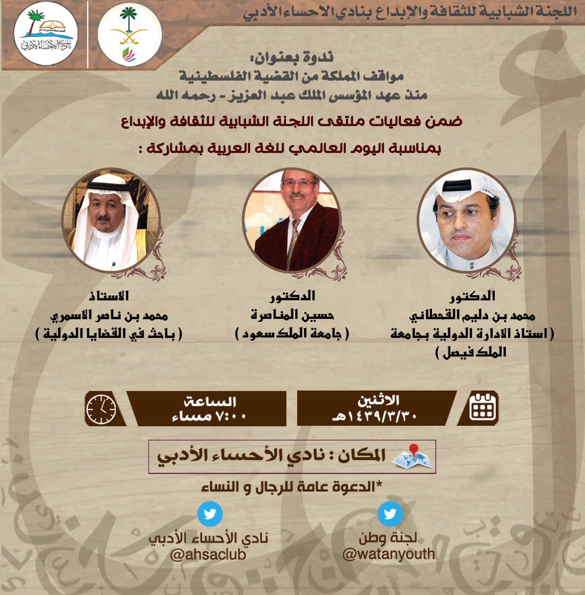 أشكر لنادي الأحساء الأدبي،الرئيس أد.ظافر الشهري،ومجلس الإدارة،واللجنة الشبابية للثقافةوالإبداع،على استضافتي في ندوة:مواقف المملكة من القضية الفلسطينية منذ عهد المؤسس الملك عبدالعزيزرحمه الله.وكانت هذه الندوة احتفالاًثقافيًا بفلسطين قضية عربية تعيش في قلب المملكة العربية السعودية.pic.twitter.com/C0UzX3LZFr