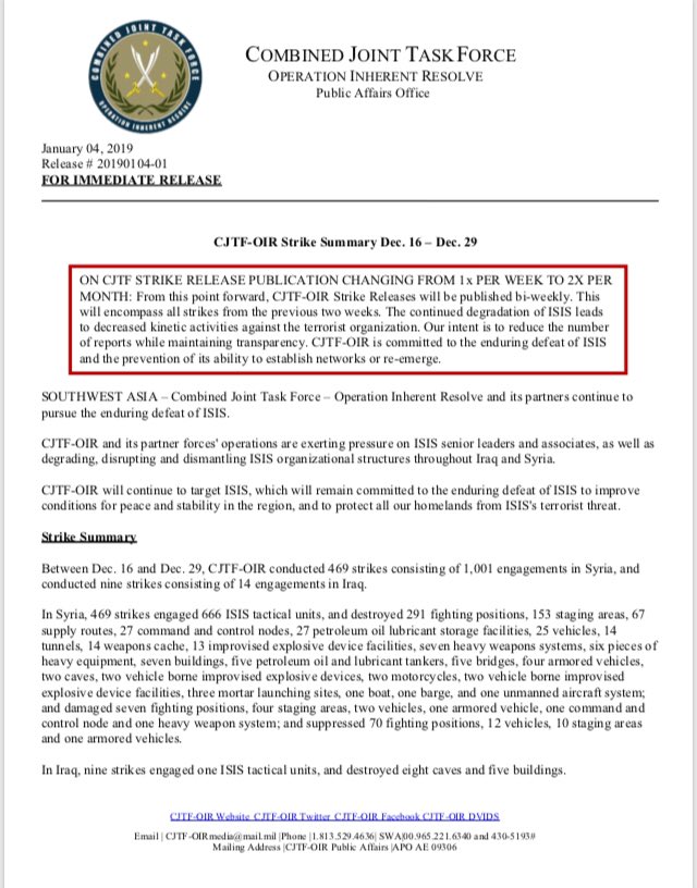 ISIS defeated? The military just released airstrike data in Syria from 12/16-12/29 that said 469 strikes hit 666 ISIS tactical units, & destroyed 291 fighting positions, 153 staging areas, 67 supply routes, 27 command & control nodes, 13 IED facilities, 4 armored vehic...pic.twitter.com/Ev0s0Sc1a3