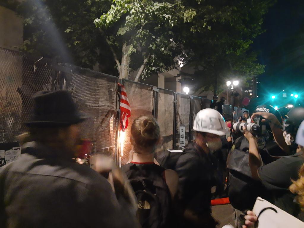 A barrage of pepper balls and then the feds disappear back inside. Protesters offer eye wash. No one seriously hurt