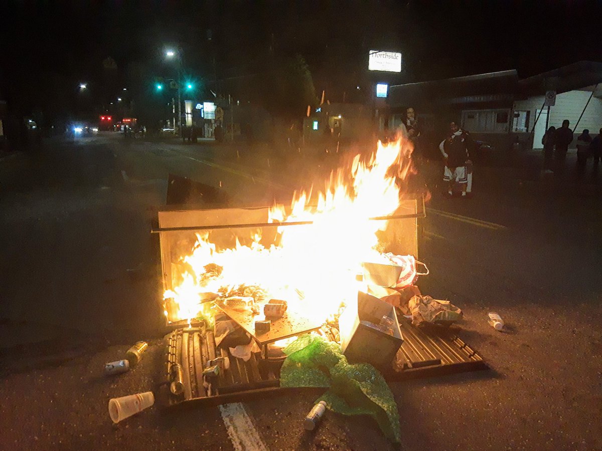 A second dumpster fire burns: now one on each end of the protest I'd take a picture but come on, it's 2020, you know what a dumpster fire looks like