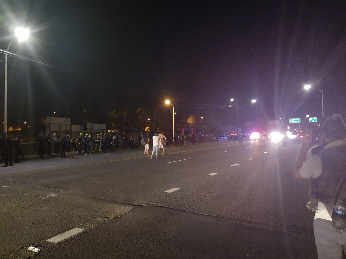 While we're walking, let's talk about tonight's new tactic They met the march in the road and said nothing. A couple times They waited for something to be thrown, then declared an unlawful assembly But if no one had thrown anything they would, presumably, have kept blocking