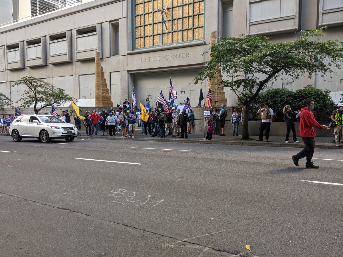 I missed the end of this little adventure. Some chud absolutely filled the air with mace and I got that spicy sensation The protest is currently walking back towards the JC from 6th and Columbia. No sign of the chuds, I assume they retreated