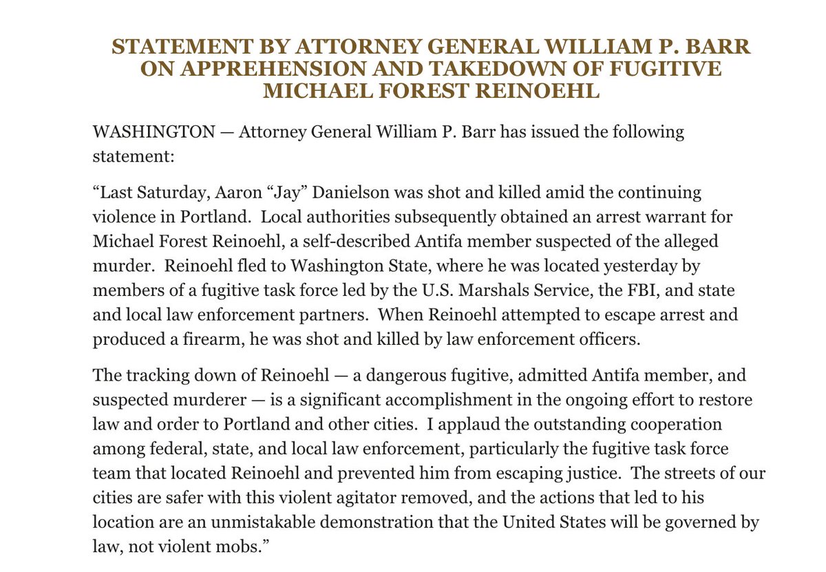 Reinoehl went out of his way to state several times in his VICE interview that he is NOT a member of Antifa or any organization, which makes Barr's decision to call him a confessed Antifa member, TWICE, a disturbing one The agenda here is clearhttps://twitter.com/maxoregonian/status/1301929379484721152 …