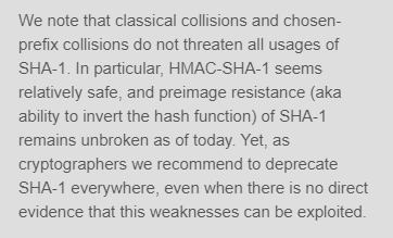 Does anyone else worry about pronouncements like "In a nutshell, this means a complete and practical break of the SHA-1 hash function" in the first para, which subsequently go on to include stuff like:https://twitter.com/spazef0rze/status/1214823005081292800 …