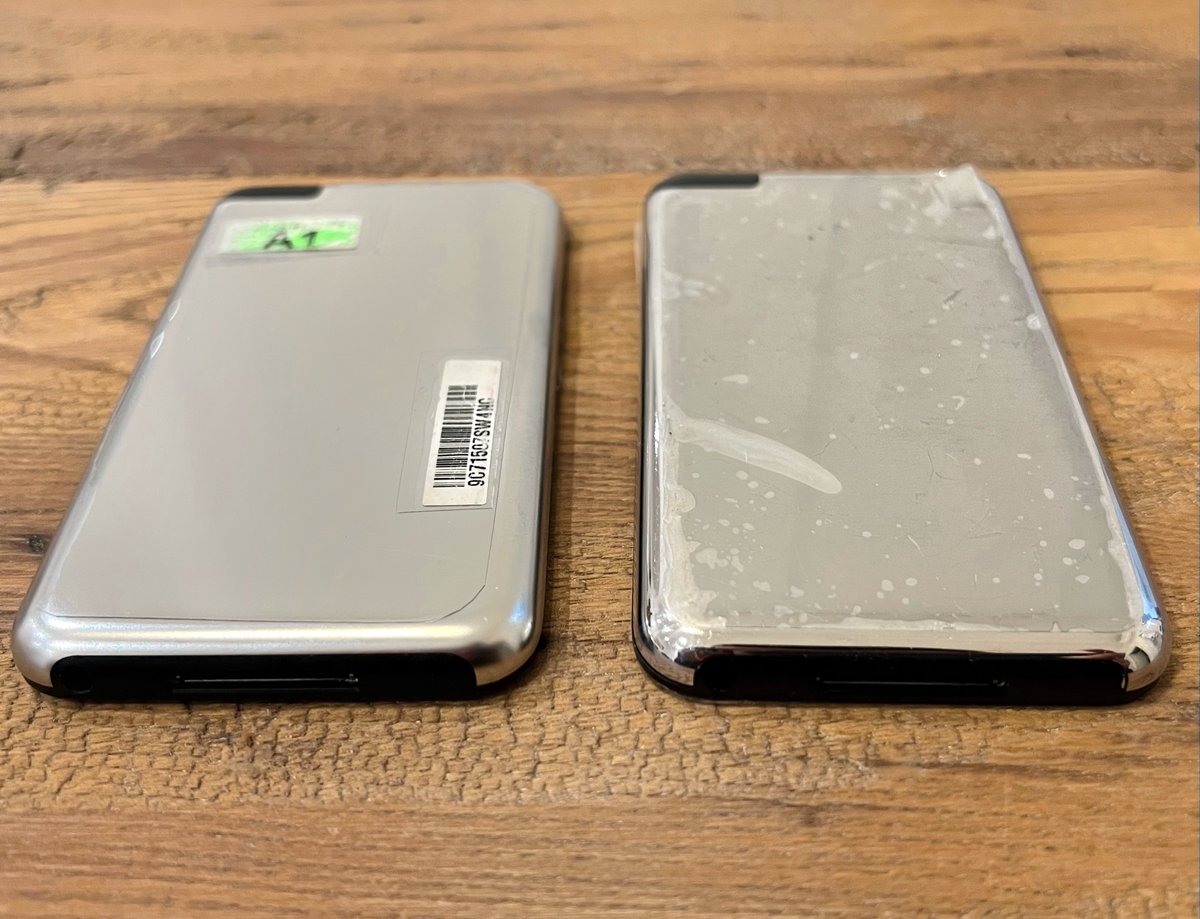 First generation iPod touch prototypes. On the left, PreEVT A1 config with a titanium finiture housing. On the right, PreEVT C3 config with regular stainless steel polished housing.