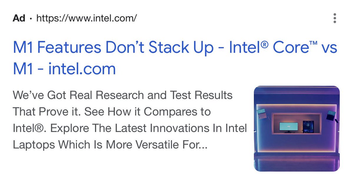 When you search for Apple M1 with Google, you might see this Intel ad. I opened it, but the only test result there is that an Intel laptop gets 9+ hours of battery life. It does not prove anything. I hoped the “real research and test results” would be a bit more compelling.pic.twitter.com/oygIHTZEXr