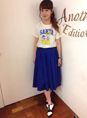 濃いブルーのスカートと、Tシャツのロゴを合わせて統一感のあるおしゃれコーデです♥︎