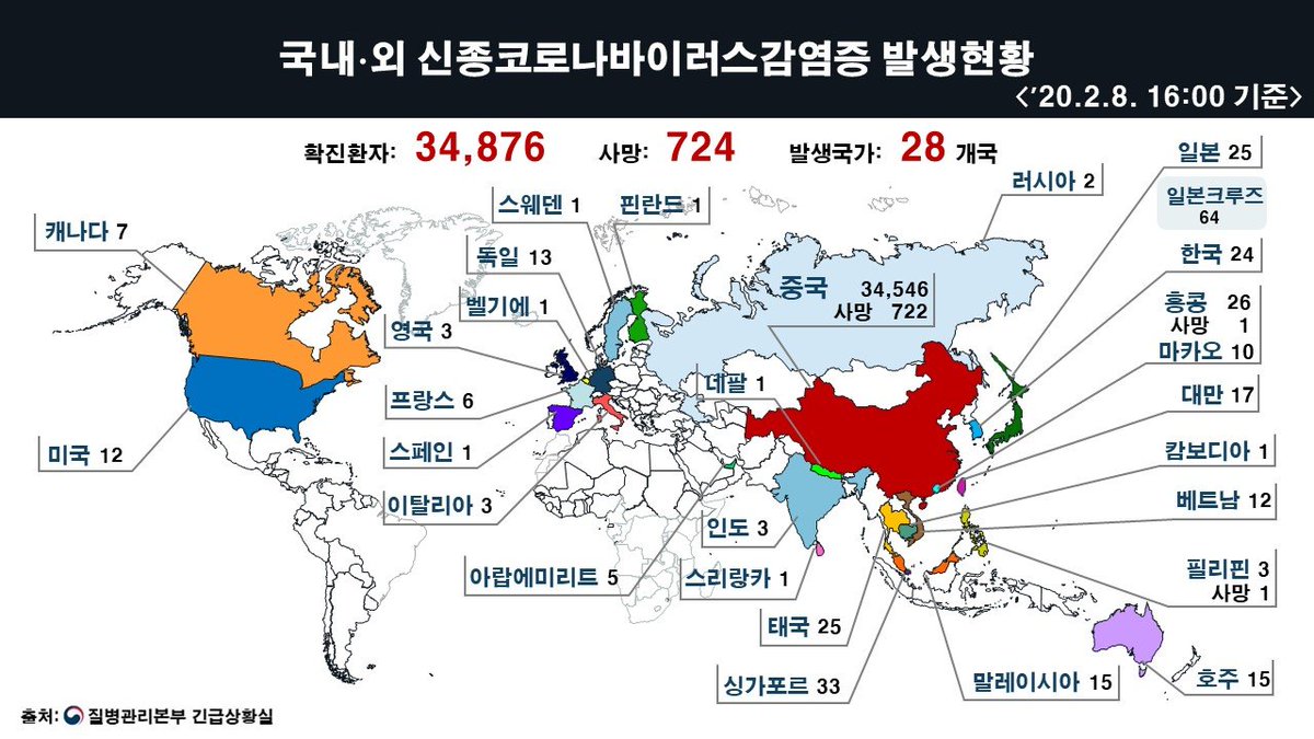 신종 코로나바이러스 감염증 발생 현황(2.8. 16시 기준) [전체] 환자 총 34,852명(사망 724) [한국] 확진환자 24명, 퇴원 2명 [중국] 34,546명(사망 722)pic.twitter.com/TjFlrh5VQb