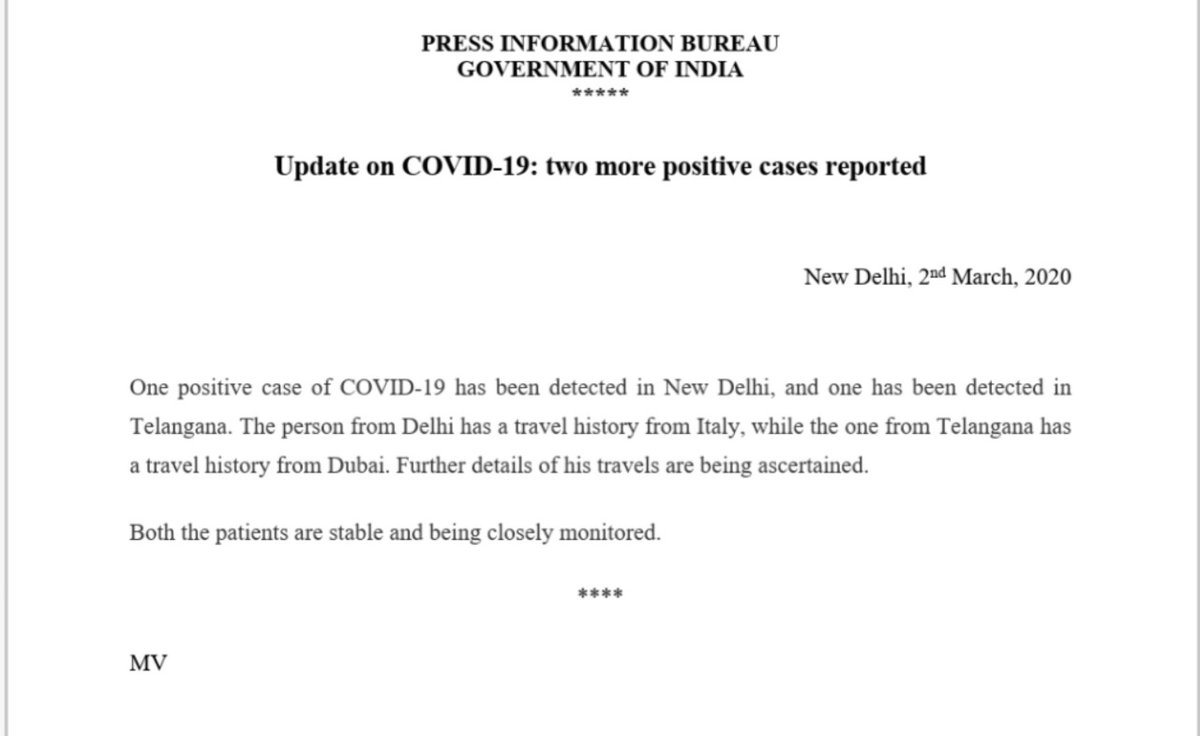 Hi 2 fresh cases reported in India. One from Delhi and one from Telangana state. Kindly update u r tweets.