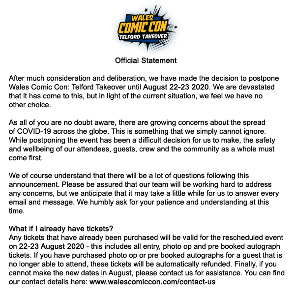Sorry, but this is the wise decision. Hope we would meet in August. Take care, friends~https://twitter.com/walescomiccon/status/1238555681491496961 …