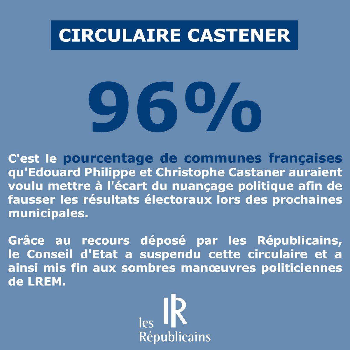 @Conseil_Etat à la demande de @lesRepublicains suspend la#CirculaireCastaner qui aurait « pour effet de ne pas prendre en compte l’expression politique manifestée par plus de 40 % du corps électoral » et « méconnaît le principe d’égalité » au profit de LaREM.pic.twitter.com/lnnY8BzqmB