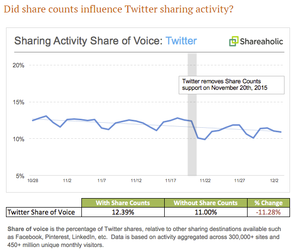 Twitter's removal of share counts has cost them ~11% of sharing activity so far https://blog.shareaholic.com/sharing-to-twitter-declines-11-after-twitter-kills-share-counts/ … pic.twitter.com/hBJeHkjZs2