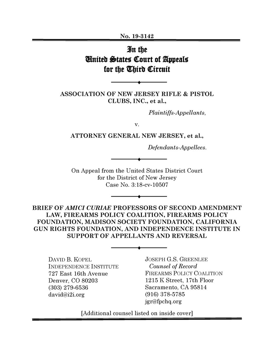 ANJRPC v Grewal (3rd Circuit): Brief of Amici Curiae Professors of Second Amendment Law, Firearms Policy Coalition, Firearms Policy Foundation, Madison Society Foundation, California Gun Rights Foundation, and Independence Institute https://d3n8a8pro7vhmx.cloudfront.net/firearmspolicycoalition/pages/191/attachments/original/1580790656/2020-2-3-ca3-anjrpc-fpc-amicus.pdf …pic.twitter.com/3ztrcLYzyh