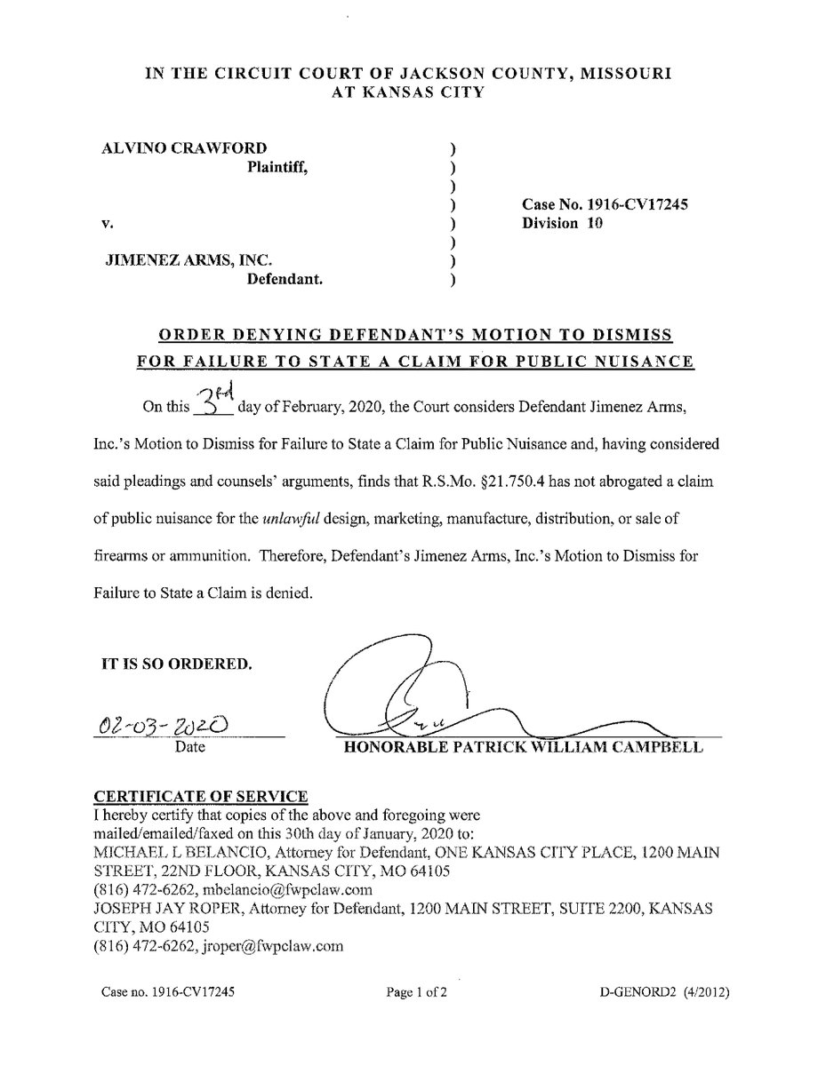 Crawford v Jimenez Arms (MO state court): Order Denying Defendant's Motion to Dismiss for Lack of Personal Jurisdiction https://everytownresearch.org/documents/2020/02/crawford-order-denying-defs-mtd-for-lack-of-personal-jurisdiction.pdf/ …pic.twitter.com/dOnkhmLonE