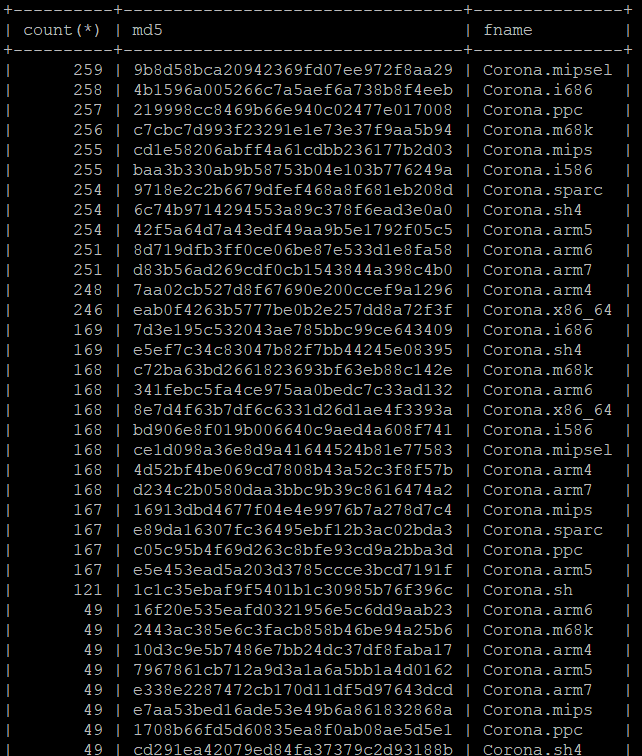 Now I understand why so many Gafgyt and Mirai variants were named Corona, as shown in my download DB. The authors wanted their shit to spread like a real corona family of virus.pic.twitter.com/6iel2OXl7C