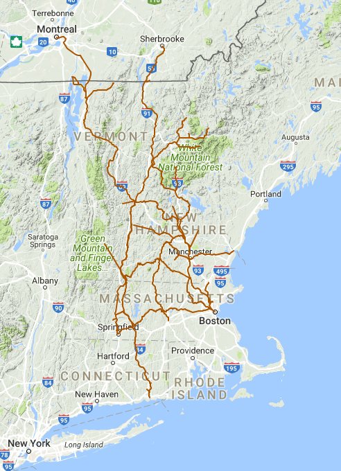 Rebuilding railways in and around New Hampshire: crude map of likely express routes & geographic maps of all routes (one or two aren't finished in the latter, and so show up as straight lines)