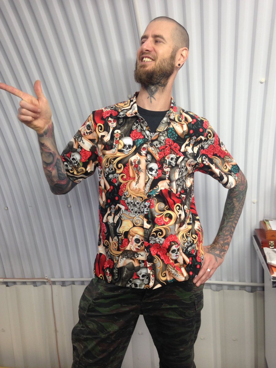 The gorgeous @EternalArtEssex modelling the new skulls and sugar skull pin up shirt.