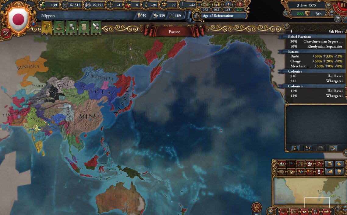Next planned colonies are for the Galapagos Islands and South Africa, both are already within range Buuut maybe I should get two more in Australia so they become a colonial nation...and I need more in California too, and to start on Mexico...