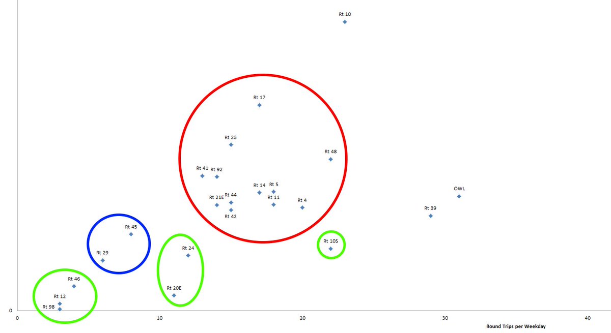 Hitting the bottom now--a lot of zooming in necessary here. In red you have what I'll call "stragglers," routes with poor ridership which can usually be attributed to poor frequency. Most of these run every hour, although the 17 runs every 45min and the 4 runs every 40 min.pic.twitter.com/SBPN5ZDSTD
