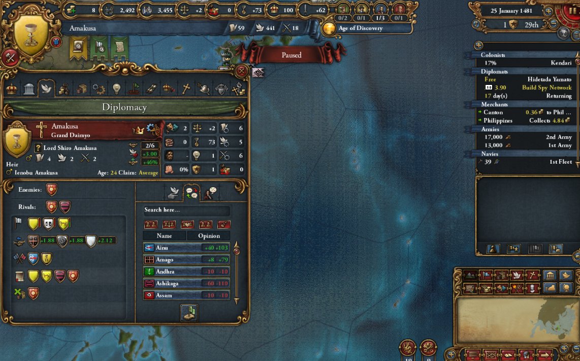 Ideas so far are Offensive, Exploration, and Religious (incomplete) Managed to convert even large cities like Settsu, Kyoto, Surabaya, and Brunei