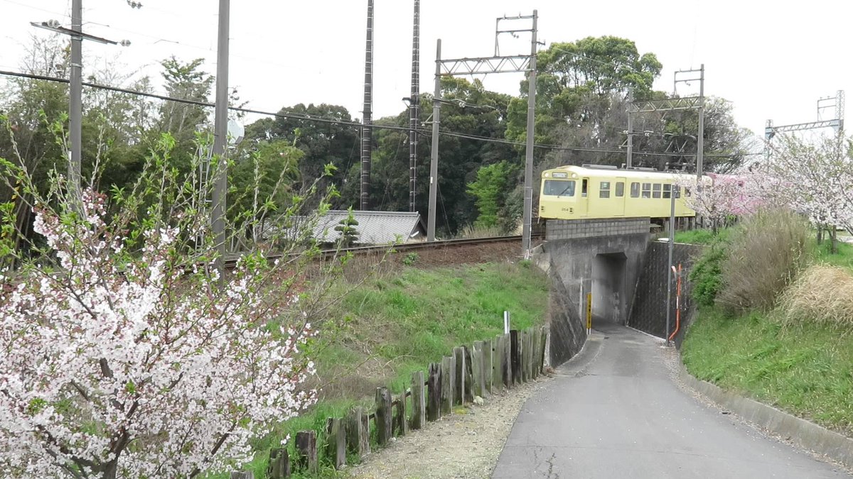 The railway starts at Kintetsu Yokkaichi Station. The next stop, Akahori, has a magnificent tree at the entrance.