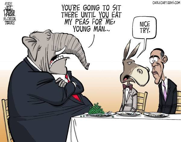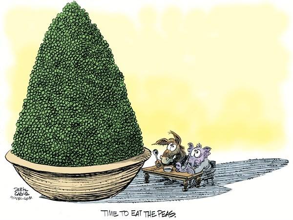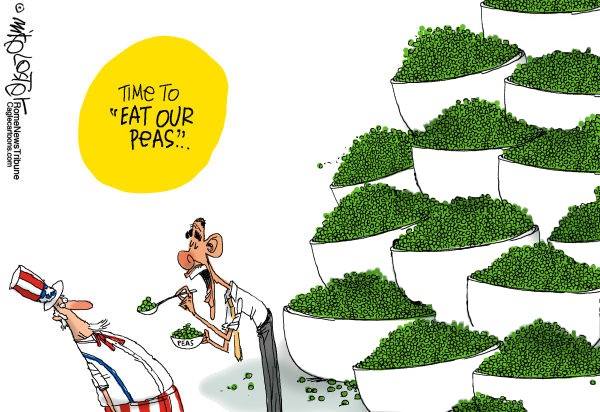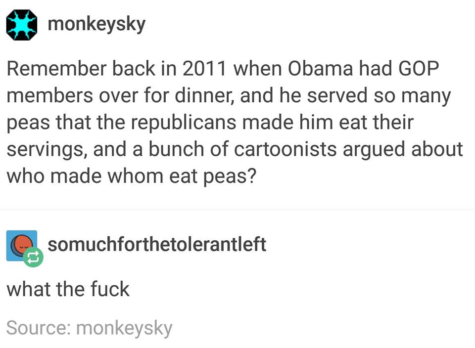 the dinner story is made up, "eat your peas" was a remark made by Obama in reference to debt ceiling negotiations.https://www.cbsnews.com/news/obama-time-to-eat-our-peas-and-pass-debt-deal/ …