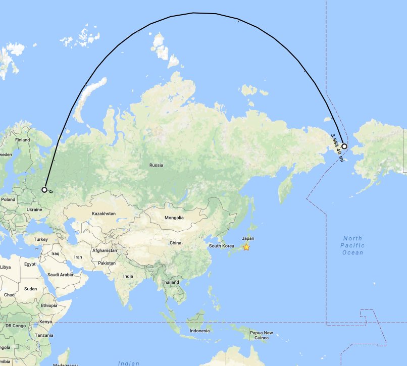 that map isn't showing a proposed route--it's showing the shortest distance between Moscow and Uelen