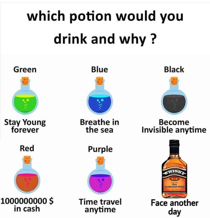 Drink the purple potion, then repeatedly travel to just before I made my choice so I could take all the others! Unless that would break time or something, then I'd just go with green. Think of how much you could accomplish if you never grew old.