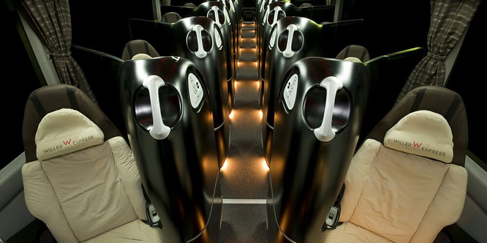 Finally, the "Reborn" option: 3 seats per row (18 per bus), with an amazing 156 degree recline! Seats are 59cm wide, with 60.6cm of arm space. Amazingly, this isn't their most expensive option! But it's certainly not cheap, either, ranging from $110 to $120pic.twitter.com/wgFnfOU7q0