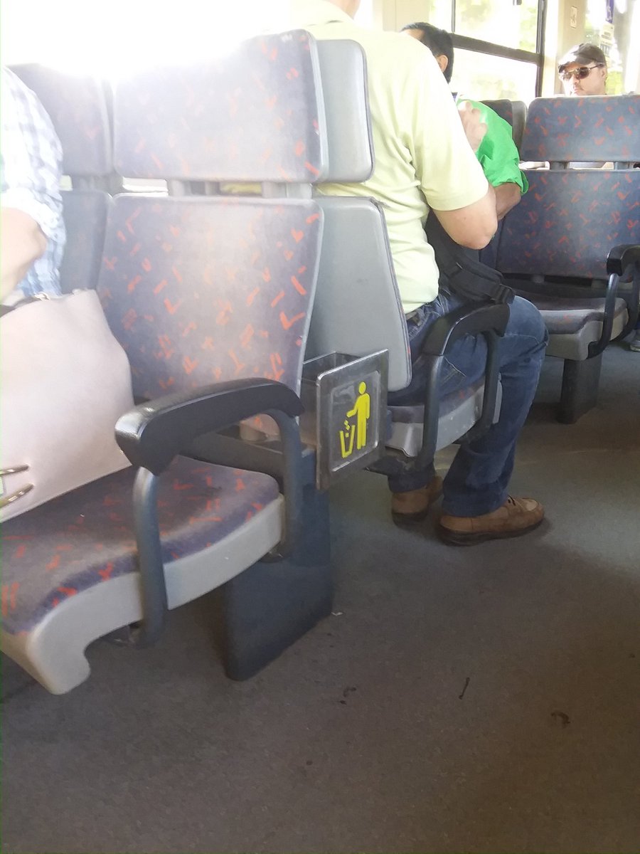 Unobstructed aisle, open anyways, and overhead luggage racks--excellent! The seats were hard, alas... Nice little trash bins between seats--the train wasn't in perfect shape but at least there was no litter or spillspic.twitter.com/tsiTPGktEA