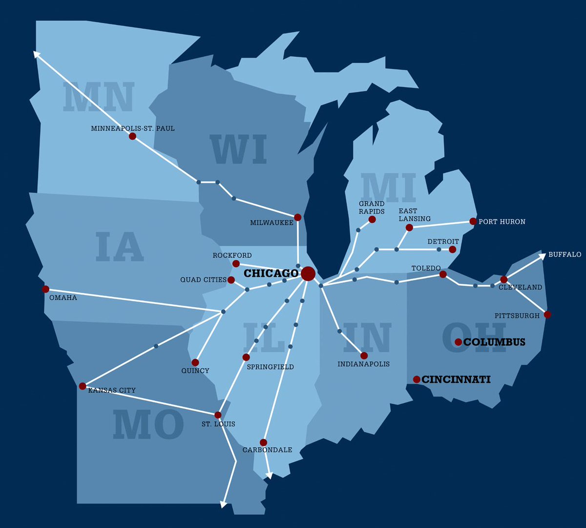 MIDWEST DEMAND IS VERY UNIQUE THOUGH, SURPRISINGLY LITTLE TRAFFIC (OUTSIDE OF FREIGHT) BETWEEN MAJOR NODES WE GET LOTS OF RAIL PROJECTS THAT DIE OFF DURING PLANNING STAGE BECAUSE THEY DESIGN IN COASTAL FASHION, THE NUMBERS NEVER ADD UP COMPARE BAD 1ST IMAGE TO GOOD 2NDpic.twitter.com/9dNKNMmURA