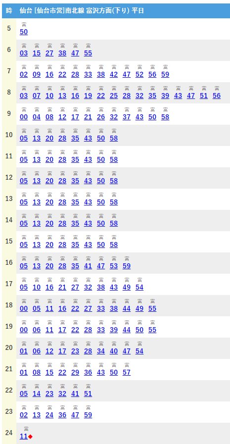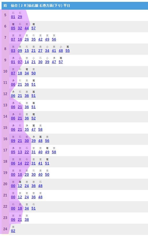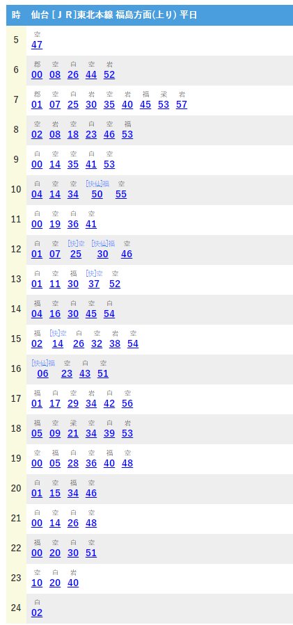 Senseki Line, outbound schedule from Sendai. Good suburban rail timetable for modest city (metro area population 1.6 million--Boston's metro area has 4.7 million)pic.twitter.com/UwLKjDIK2M