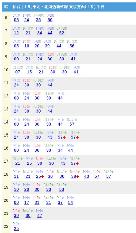 Other weekday outbound timetables for Sendai Station, in order: - Senzan Line (to Yamagata) - Joban Line (to Haranomachi) - Tohoku Line (north to Rifu and Kogota) - Tohoku Line (south to Fukushima)pic.twitter.com/dpbYASMY9W
